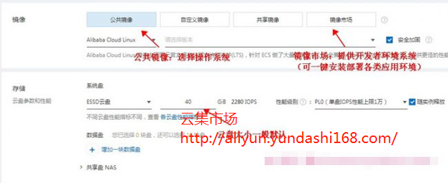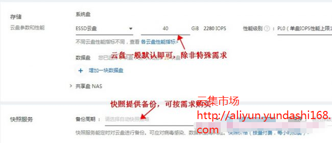 (3)、系统盘默认就可以了,如果想要系统性能好点,可以选择 SSD 类型的系统盘。存储(云盘)选择默认就好,就选40GB