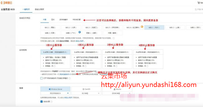 1、选择地域及可用区:选择地域先考虑要不要备案,选择国内节点的,都要进行备案申请,一般为半个月时间。然后按照就近原则,选择地域是你客户所在城市最近的地域。比如你的客户大量在华南地域,那么你的地域就应该选择”深圳”节点。 如果你需要免备案,不想备案处理,那么就一定要选择香港或者国外节点(比如新加坡和日本)的地域。