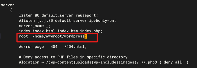 将80端口访问目录由”/home/wwwroot/default;”改为”/home/wwwroot/wordpress;”