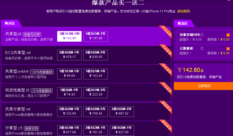 一.如果我们是新用户,对于云服务器的配置需求不是很高,同时还需要搭配云数据库MySQL、对象存储OSS,推荐您直接关注新用户福利专场的爆款产品买一送二专区即可,购买并支付成功还可获得一次抽iPhone 11 Pro机会。