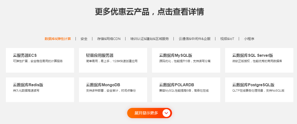 这里汇总了阿里云全站所有云产品系列的优惠产品,点击下图进行浏览