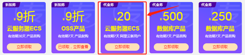 首先,有一张金额为20元的云服务器ECS代金券,就是下图红色箭头和方框这张: