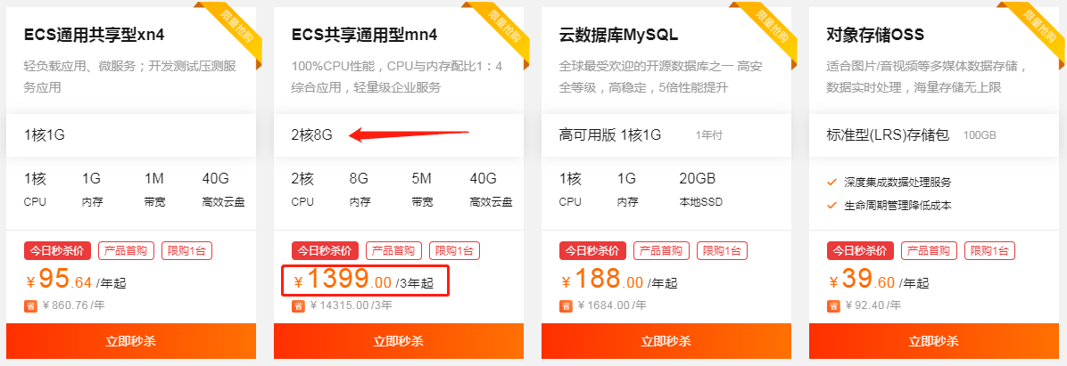 而2核8G5M这款,与之前的秒杀比起来,才更能衬托出秒杀价格的美丽:)。虽然秒杀提供的是共享机型,这款是独享机型,但是价格确实差得有点远。如果非要对标用户,那么共享的更适合个人,独享的更适合对稳定性要求很高的企业。