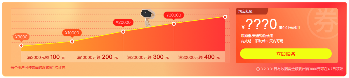 累计有效消费金额满30000元的订单,可领400元淘宝现金红包