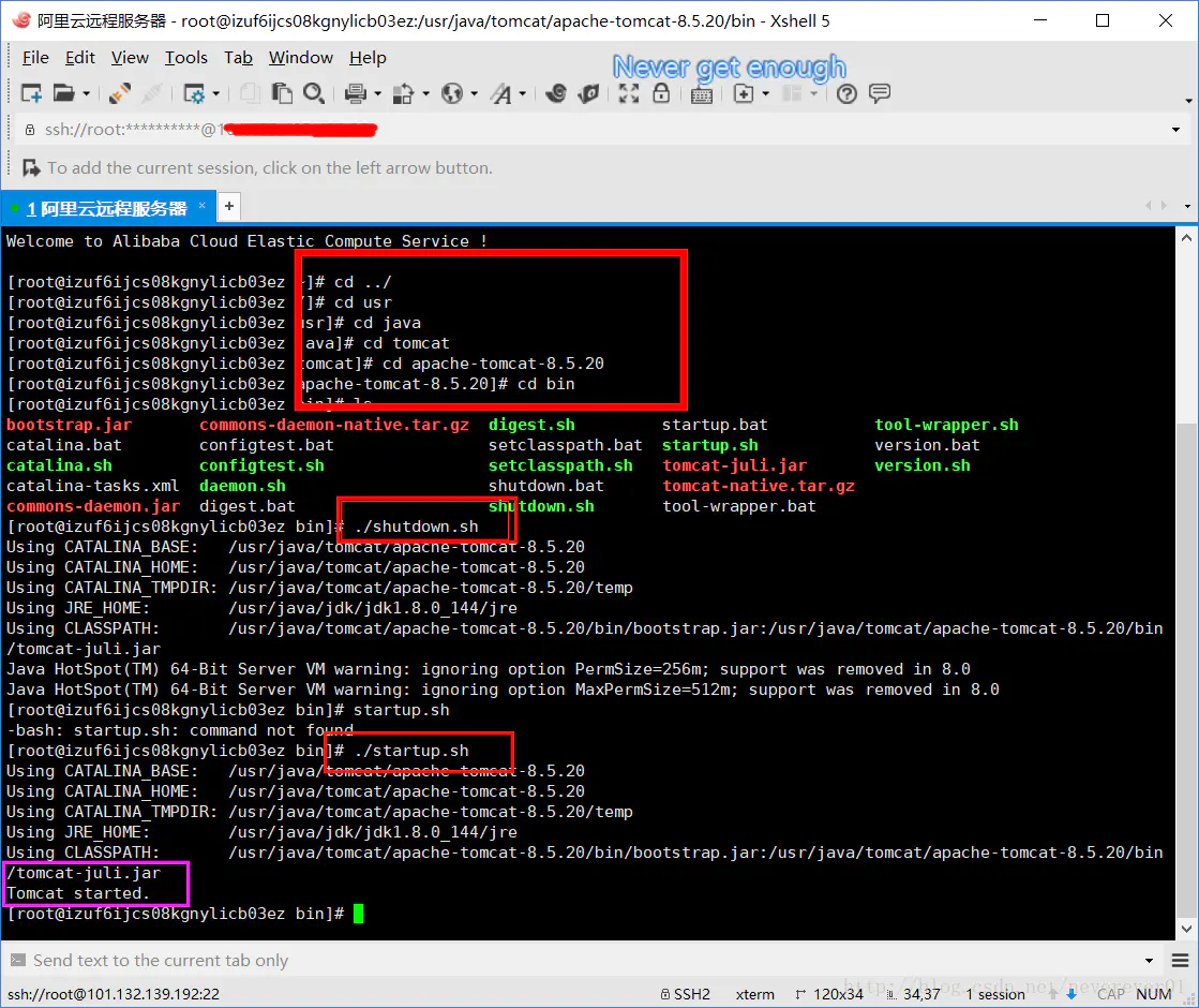 用xshell进入/usr/java/tomcat/apache-tomcat-8.5.20/bin/