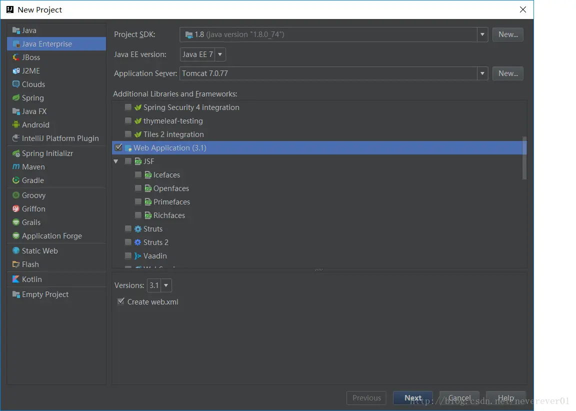 不过上面的教程之涉及到在服务器上配置Java与Tomcat环境,相当于你只是搭了一个房子,但是里面还没有任何家具,不能入住,所以接下来我们来买一些家具,首先打开IDEA,新建一个项目,选择web application。