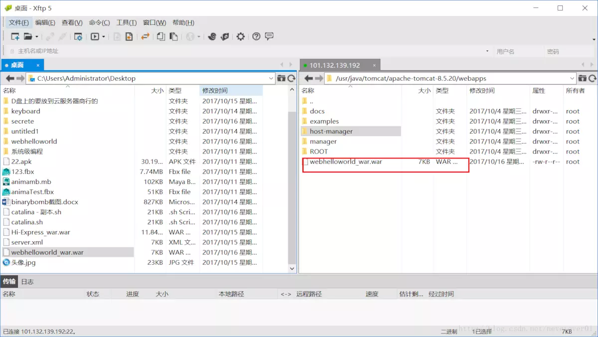 打开xshell和xftp工具,连接到云服务器,将webhelloworld_war.war放到云服务器的/usr/java/tomcat/apache-tomcat-8.5.20/webapps/下