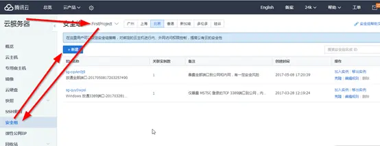 登陆腾讯云服务器,点击安全组选项,注意最上面的项目选择正确,点击安全组选择新建,