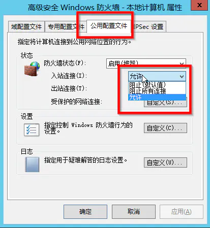 选择公用配置文件,入站链接设置为允许,然后确定,服务器配置完毕.