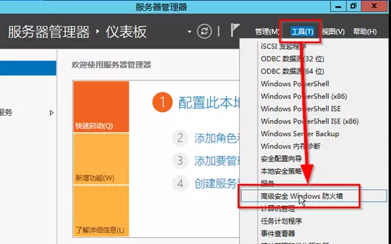 打开服务器管理器,右上角工具—高级安全windows防火墙,