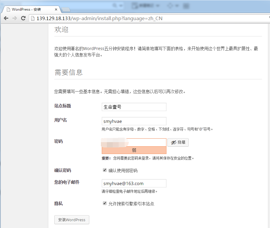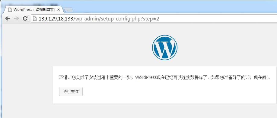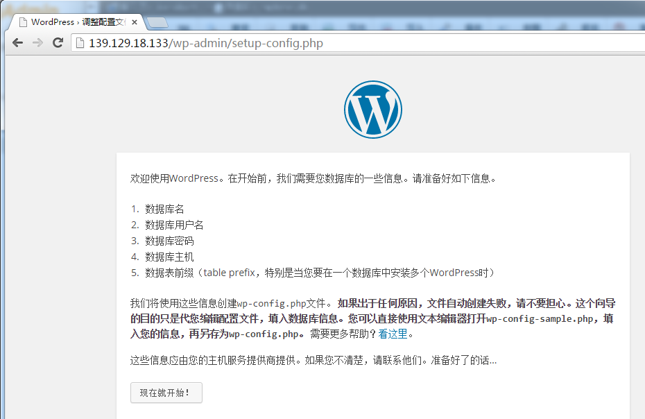 使用浏览器访问阿里云的公网ip,会进入wordpress的安装页面,如下图所示: