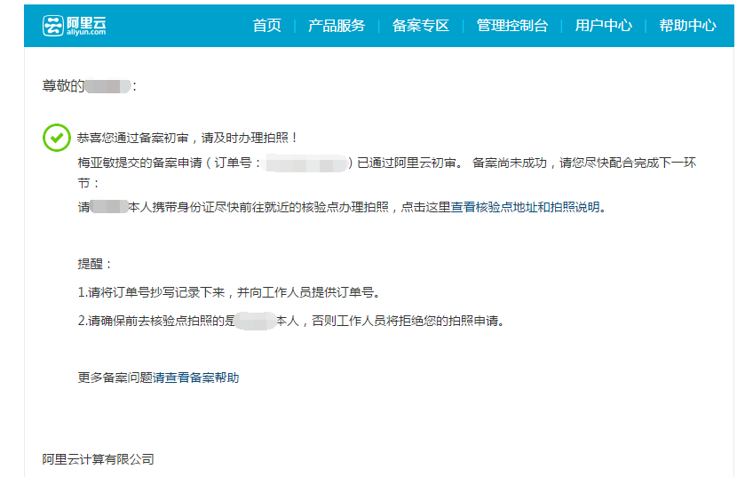 信息填完之后,阿里云那边会进行初步审核,我当时不超过几个小时就收到审核通过的邮件了。邮件的内容是: