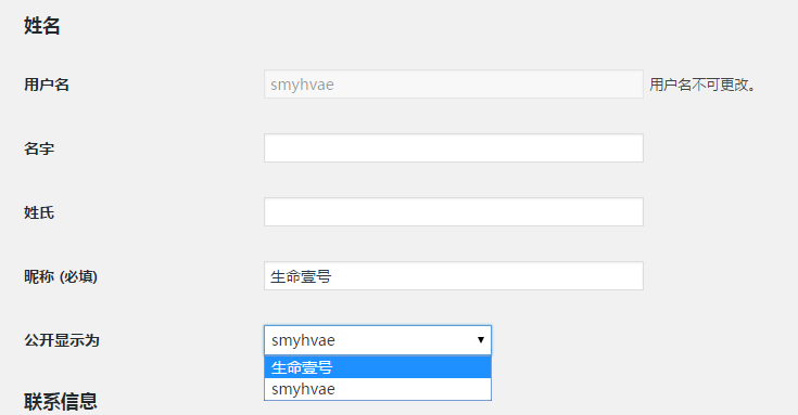 想要作者处显示中文别名,不用修改数据库,直接在后台编辑作者资料,在昵称中输入输入中文,在“公开显示为”处选择这个中文昵称即可。如下图所示: